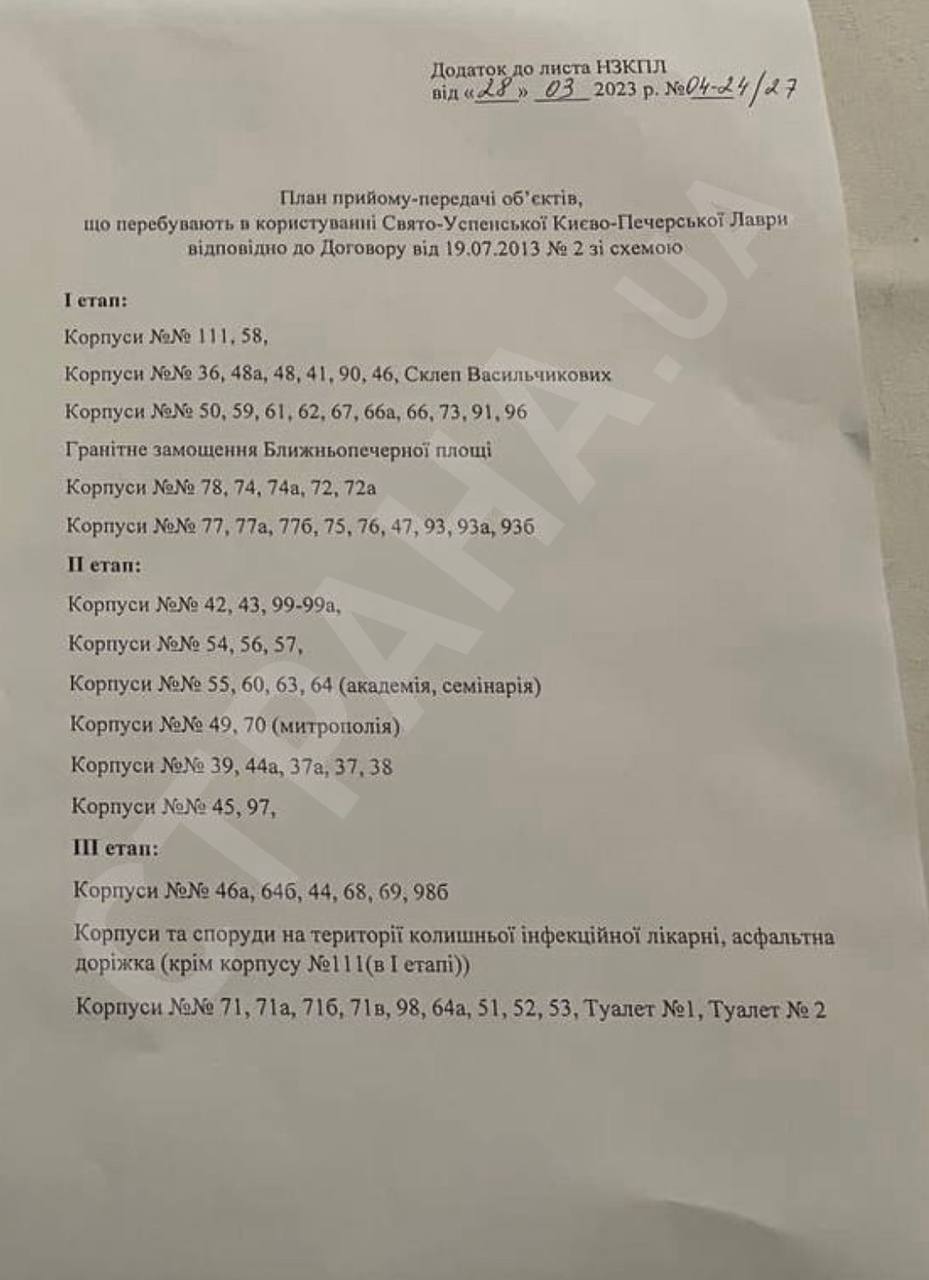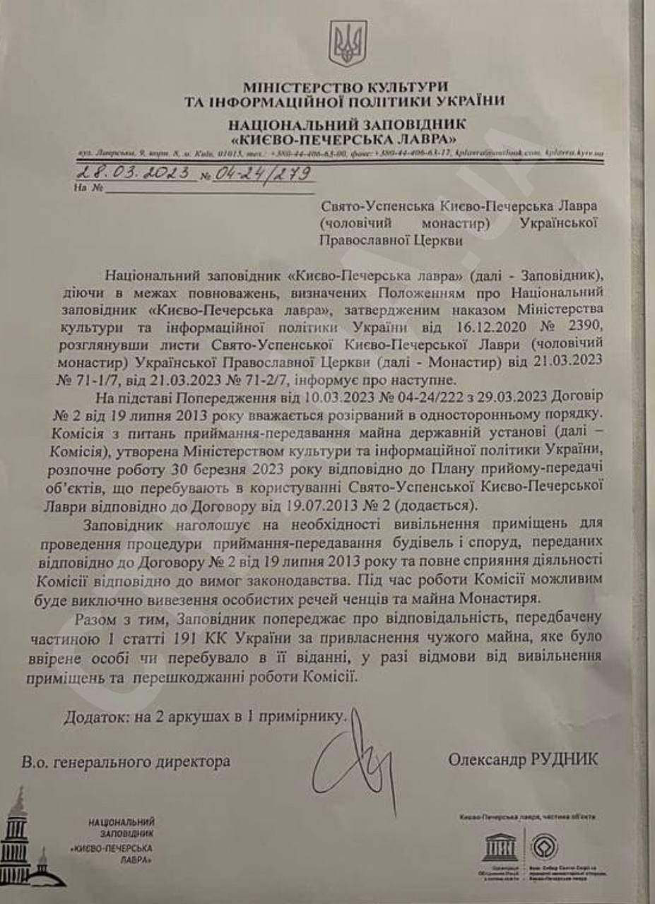 "На основании Предупреждения от 10.03.2023 №04-24/222 с 29.03.2023 Договор №2 от 19 июля 2013 года считается расторгнутым в одностороннем порядке. Комиссия по приему-передаче имущества государственному учреждению (далее - Комиссия), образованная Министерством культуры и информационной политики Украины, начнет работу 30 марта 2023 года в соответствии с Планом приема-передачи объектов, находящихся в пользовании Свято-Успенской Киево-Печерской Лавры", - говорится в документе.