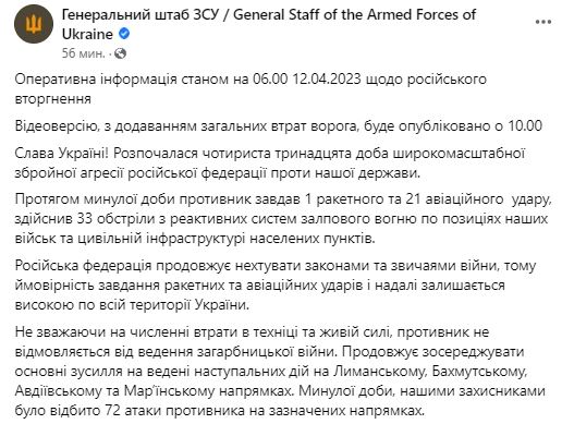 В среду, 12 апреля, Генштаб ВСУ обнародовал сводку о ситуации на фронте за минувшие сутки.