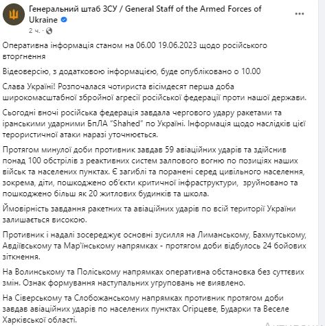 В понедельник, 19 июня, Генштаб ВСУ обнародовал сводку о ситуации на фронте.