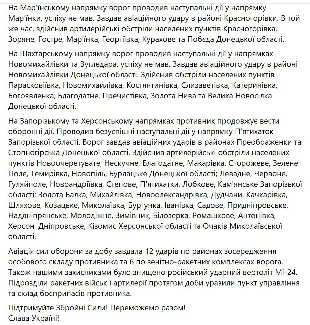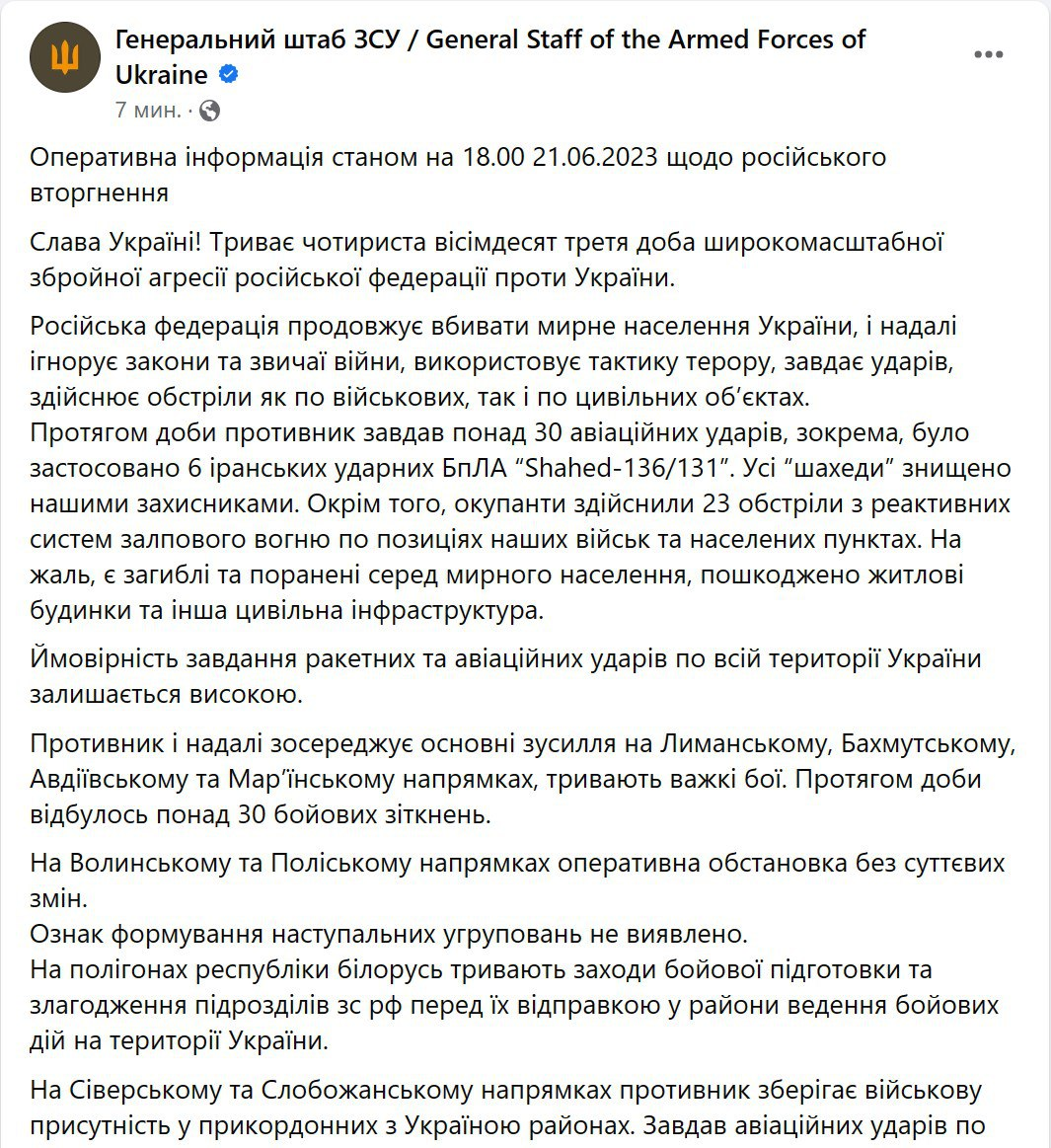 В среду, 21 июня, Генштаб Вооруженных сил Украины опубликовал новую вечернюю сводку с фронта.
