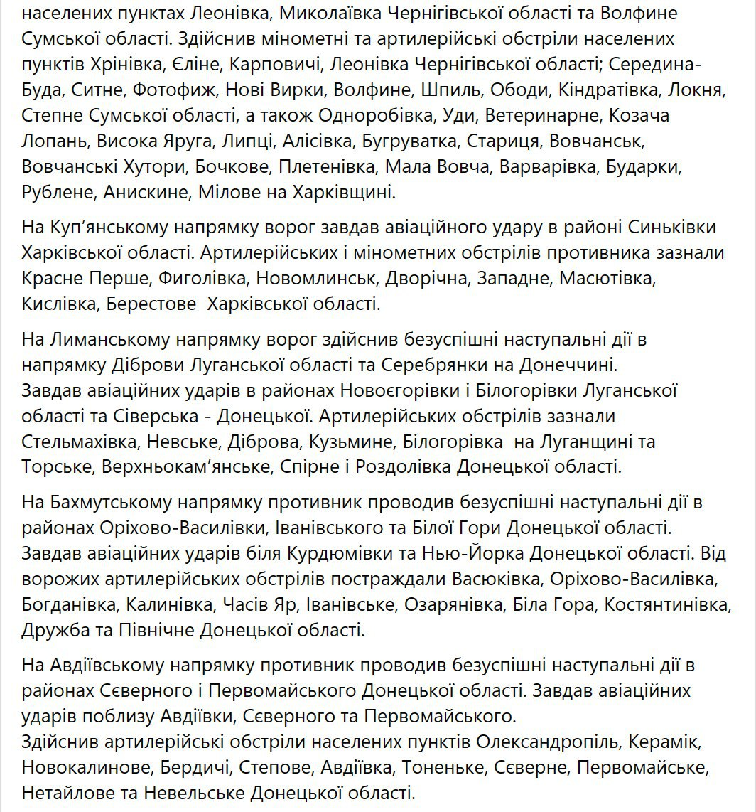 - На Лиманском направлении противник вел наступательные действия в направлении Дибровы и Серебрянки. Под Бахмутом - в районах Орехово-Васильевки, Ивановского и Белой Горы.