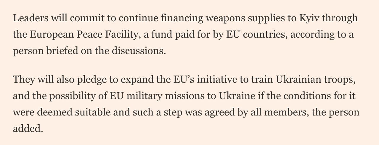 "Они также обещают расширить инициативу ЕС по обучению украинских военнослужащих и возможность военной миссии ЕС в Украине, если условия для этого будут сочтены подходящими и такой шаг будет согласован всеми членами", - сообщает источник издания.