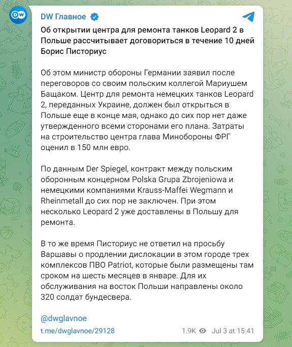 Центр для ремонта немецких танков Leopard 2, переданных Украине и пострадавших во время боев, должен был открыться в Польше еще в конце мая, однако до сих пор нет даже утвержденного всеми сторонами его плана. Затраты на строительство центра глава Минобороны ФРГ оценил в 150 миллионов евро.