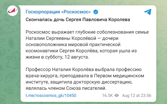 "Роскосмос" выражает глубокие соболезнования семье Наталии Сергеевны Королёвой — дочери основоположника мировой практической космонавтики Сергея Королёва, которая ушла из жизни в субботу, 12 августа", - сказано в записи корпорации.