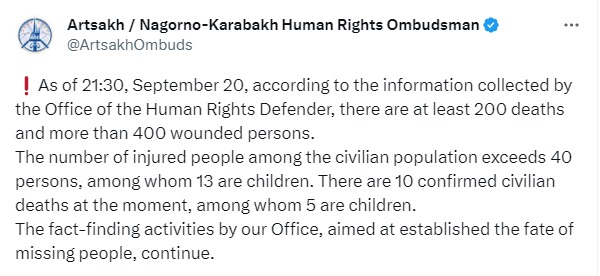 "По состоянию на 21:30 20 сентября, по данным офиса защитника прав человека, зафиксированы не менее 200 погибших и более 400 раненых", - сказано в посте.