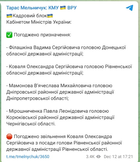 "Согласовано назначение Филашкина Вадима Сергеевича главой Донецкой областной государственной администрации", - написал Мельничук.