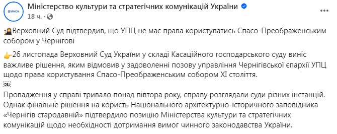 "26 ноября Верховный суд Украины в составе Кассационного хозяйственного суда вынес важное решение, которым отказал в удовлетворении иска управления Черниговской епархии УПЦ о праве пользования Спасо-Преображенским собором XI века. Производство по делу длилось более полутора лет, дело рассматривали суды разных инстанций. Однако финальное решение в пользу Национального архитектурно-исторического заповедника "Чернигов древний" подтвердило позицию Министерства культуры и стратегических коммуникаций по поводу необходимости соблюдения требований действующего законодательства Украины", - сказано в публикации ведомства.