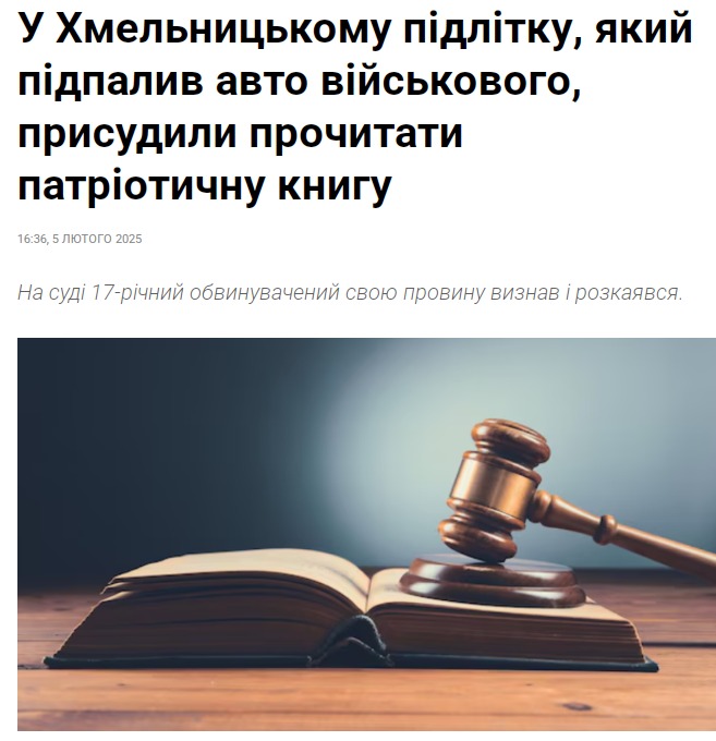 В Хмельницком 17-летний юноша из Винницы совершил поджог автомобиля военного, за что Хмельницкий горрайонный суд назначил ему условное наказание, обязав прочитать книгу "С Украиной в сердце. Патриотическая хрестоматия".