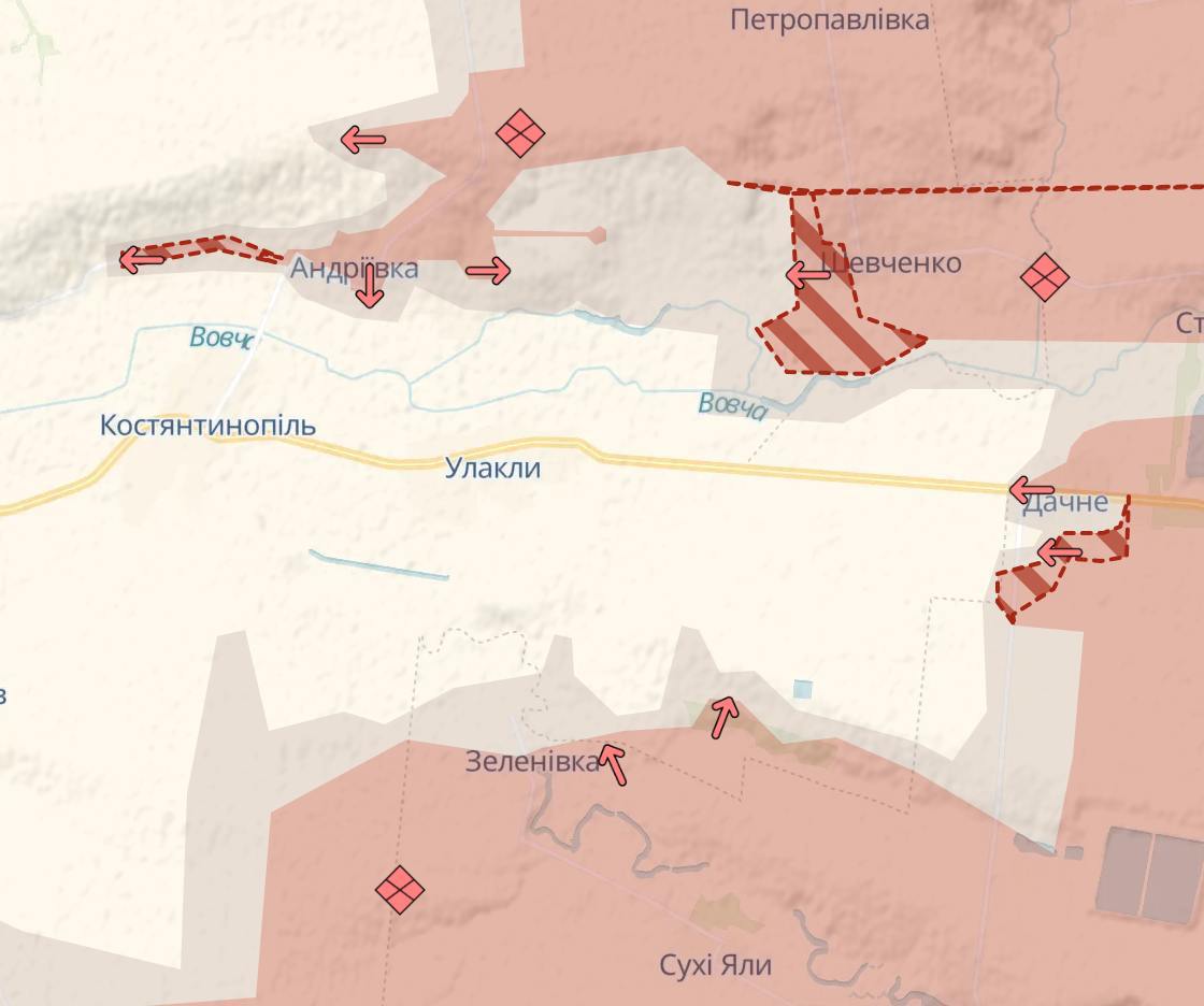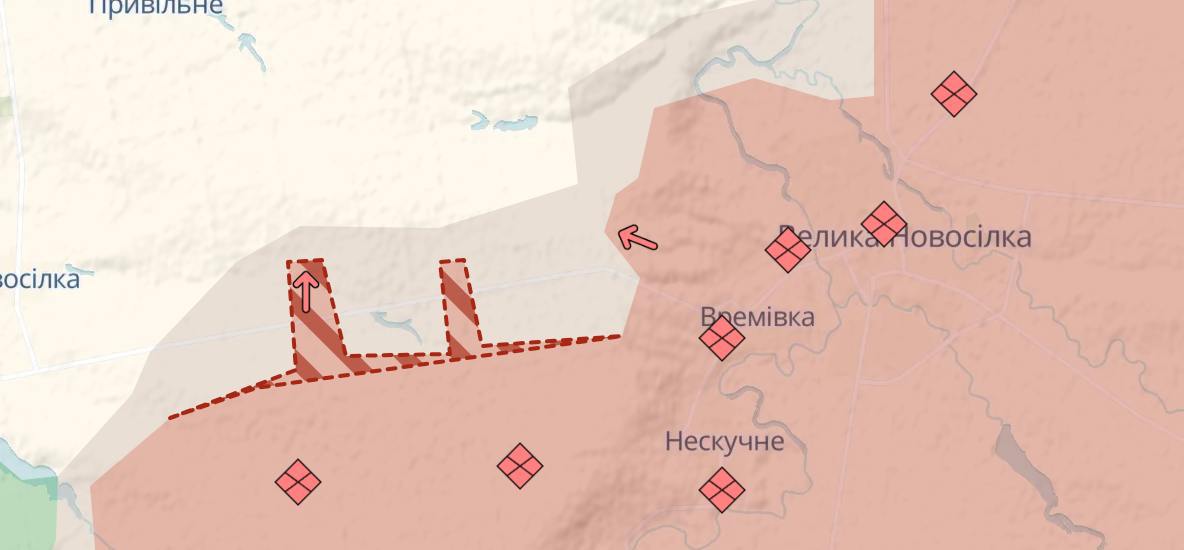 Армия РФ продолжает активно наступать к западу от Великой Новоселки, свидетельствует карта Deep State. Наступление там продолжается уже второй день.