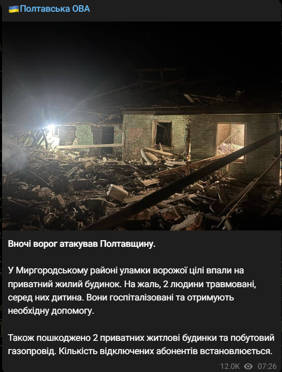 Также были сообщения о прилётах по газовой инфраструктуре в Полтавской области. В Миргородском районе обломки вражеской цели упали на частный жилой дом. К сожалению, 2 человека травмированы, среди них ребенок.