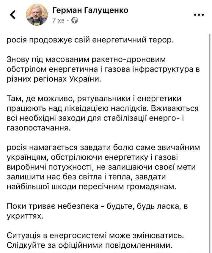 Ущерб подтвердил министр энергетики Герман Галущенко. Он заявил, что под обстрелом энергетическая и газовая инфраструктура в разных регионах Украины.