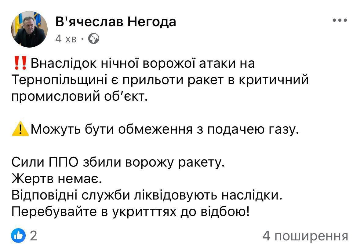 В Тернополе заявили об отключениях газа из-за попадания в промышленный объект.