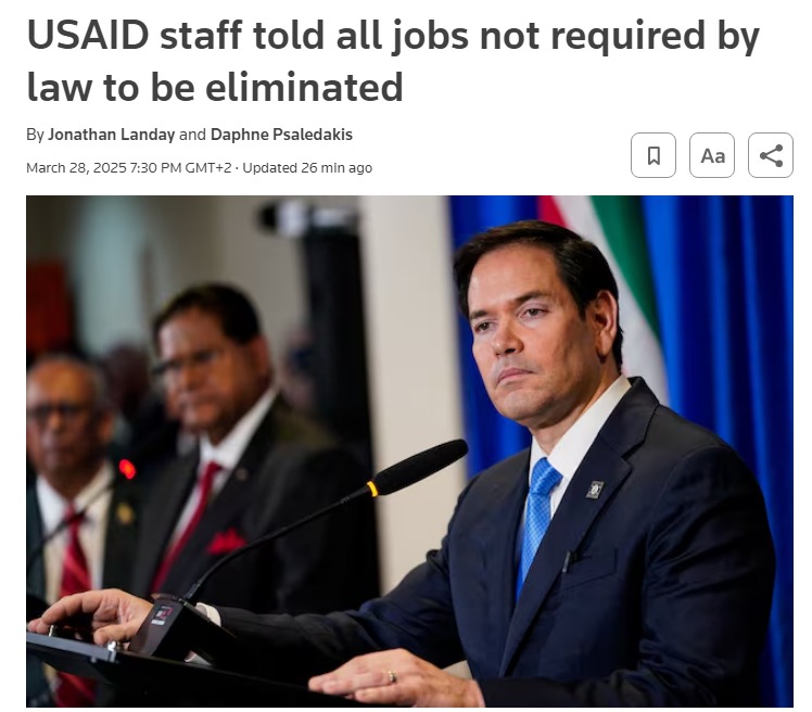Сотрудники USAID были проинформированы об этом решении запиской от члена Департамента эффективности правительства (DOGE) Джереми Левина. В записке, с которой ознакомилось агентство, Левин заявляет, что все должности USAID, не предусмотренные законом, ликвидируют, а персонал по всему миру вскоре получит электронные письма с уведомлением об этом. Причем сотрудникам предоставят на выбор дату увольнения: 1 июля или 2 сентября.