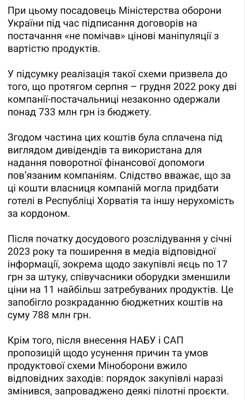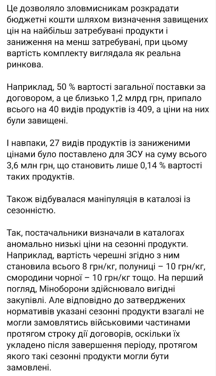 "Установлено, что в течение 2022-2023 годов Министерство обороны обеспечивало военных продуктами питания путем закупки у субъектов хозяйствования услуги по организации питания. Суть этой услуги заключалась в закупке комплекта продуктов согласно каталогу, содержавшему 409 наименований. То есть Минобороны закупало не отдельные продукты из 409, которые есть в каталоге, а все 409, стоимость которых формировала цену комплекта. Это позволяло злоумышленникам разворовывать бюджетные средства путем определения завышенных цен на наиболее востребованные продукты и занижения на менее востребованные, при этом стоимость комплекта выглядела как реальная рыночная.
