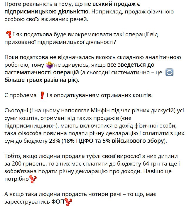 "Сегодня (и на этом настаивает Минфин в ходе различных дискуссий) все суммы средств, полученных от таких продаж ("не предпринимательских"), должны включаться в доход физического лица, такое физлицо должно подать годовую декларацию и уплатить из этих сумм в бюджет 23% (18% НДФЛ и 5% военного сбора). То есть, если человек продал туфли своего выросшего из них ребёнка за 200 гривен, то из них должен уплатить в бюджет 64 грн, да ещё и обязан подать годовую декларацию о доходах", – заявляет Южанина.