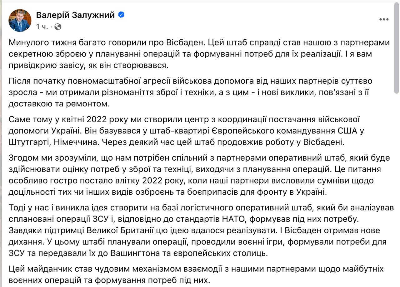 "В этом штабе планировали операции, проводили военные игры, формировали потребности для ВСУ и передавали их в Вашингтон и европейские столицы. Эта площадка стала отличным механизмом взаимодействия с нашими партнерами по поводу будущих военных операций и формирования потребностей под них", - пишет экс-главком.