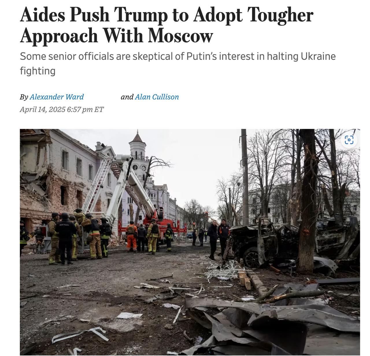 "Группа, в которую, по словам официальных лиц США, входят госсекретарь Марко Рубио и посланник по Украине Кит Келлог, рекомендовала проявлять большую осторожность в отношениях с Путиным и занять более жесткую позицию в отношении требований Москвы о территориальных уступках со стороны Киева.