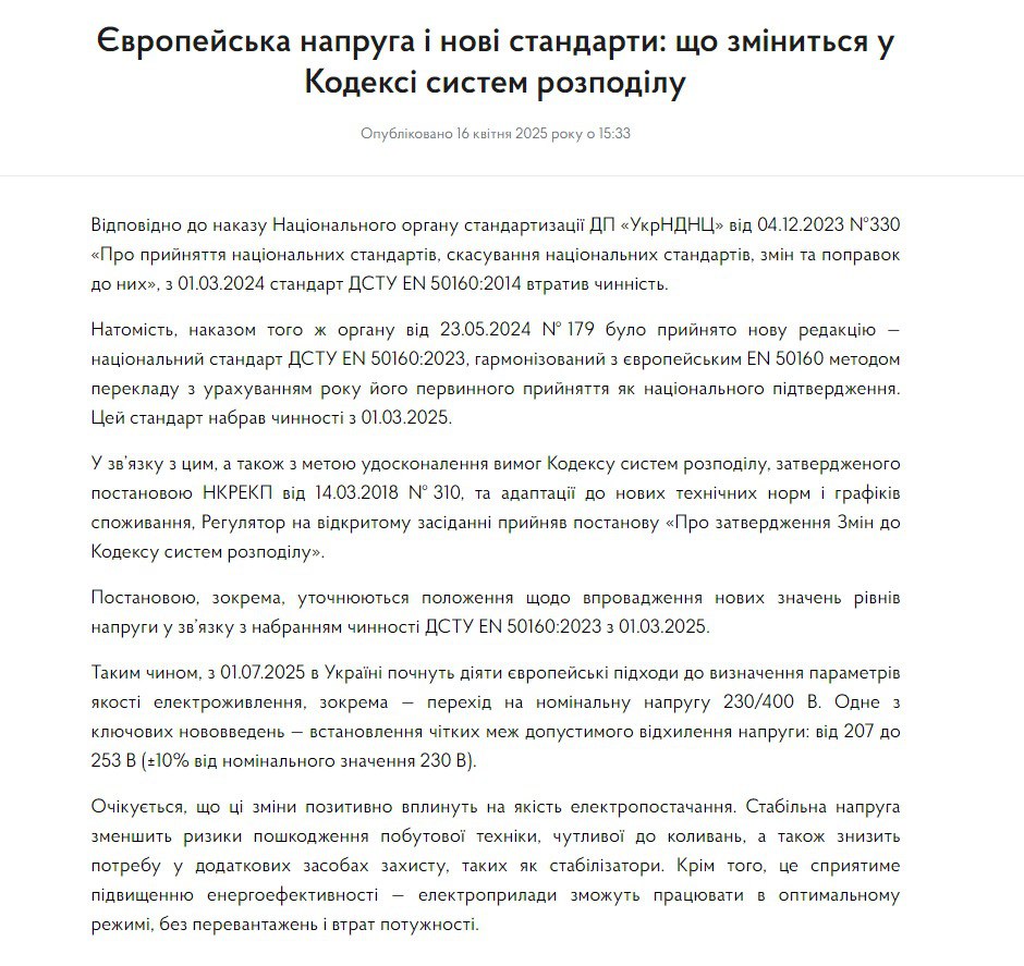 "В Украине начнут действовать европейские подходы к определению параметров качества электропитания, в частности, переход на номинальное напряжение 230/400 В. Одно из ключевых нововведений - установление четких границ допустимого отклонения напряжения: от 207 до 253 В (±10% от номинального значения 230 В)", - говорится в сообщении.