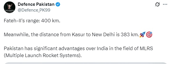 "Между тем расстояние от Касура до Нью-Дели составляет 383 км. Пакистан имеет значительные преимущества перед Индией в области РСЗО", - гласит подпись к фото.