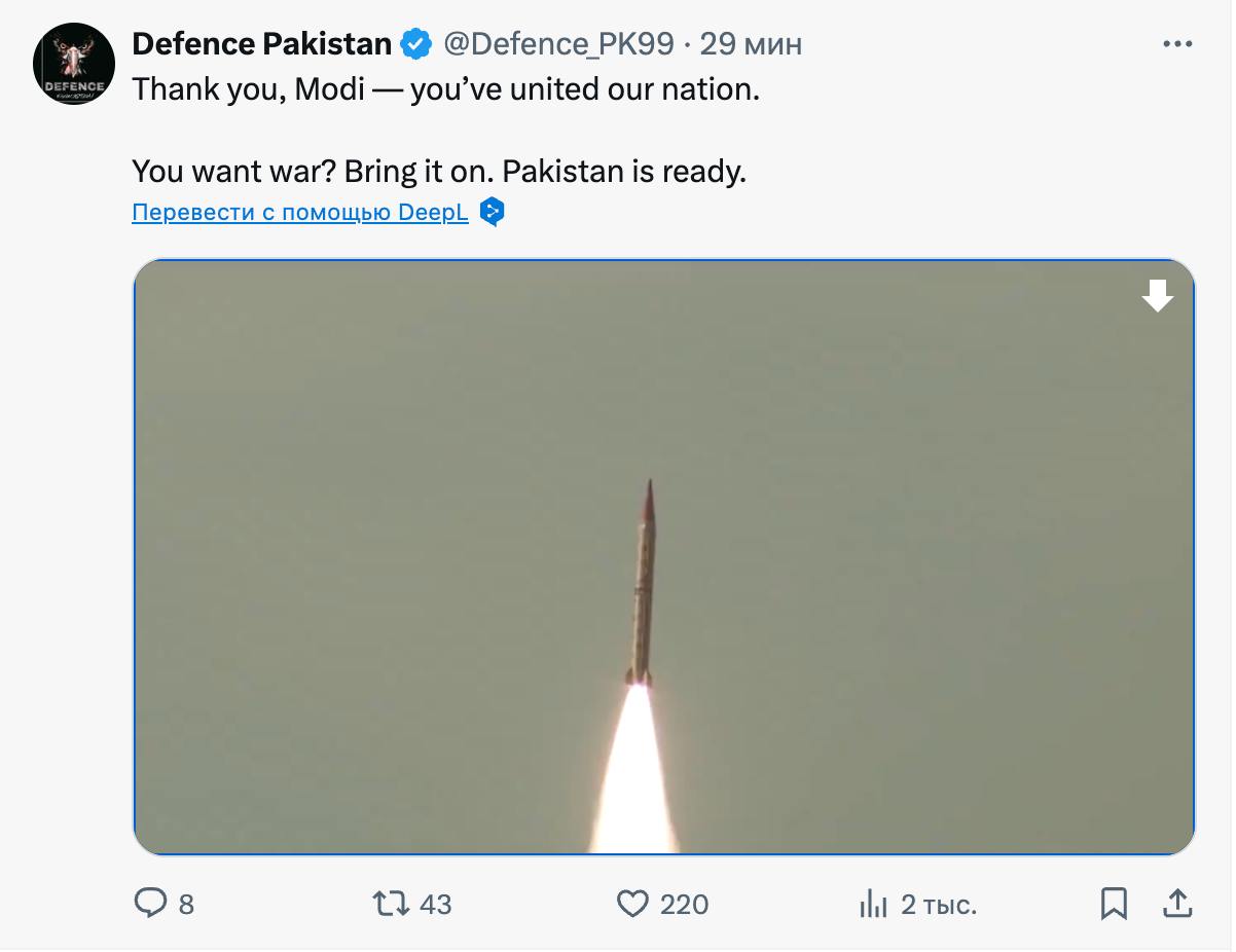 "Спасибо, Моди (премьер-министр Индии Нарендра Моди - Ред.) - ты объединил нашу нацию. Вы хотите войны? Начинайте ее. Пакистан готов", - заявило Минобороны и опубликовало вместе с текстом видео запуска ракеты.
