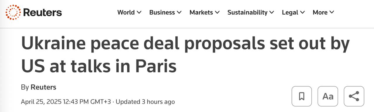 Он в целом совпадает с тем, что ранее публиковали другие западные СМИ (прекращение огня по линии фронта, юридическое признание США российского статуса Крыма, де-факто признание прочих российских территориальных захватов в Украине, запрет на членство Украины в НАТО, передача Запорожской АЭС в управление США, возвращение Украине части районов в Харьковской области, снятие американских санкций с РФ, право на проход украинских кораблей по устью Днепра и т.д.).