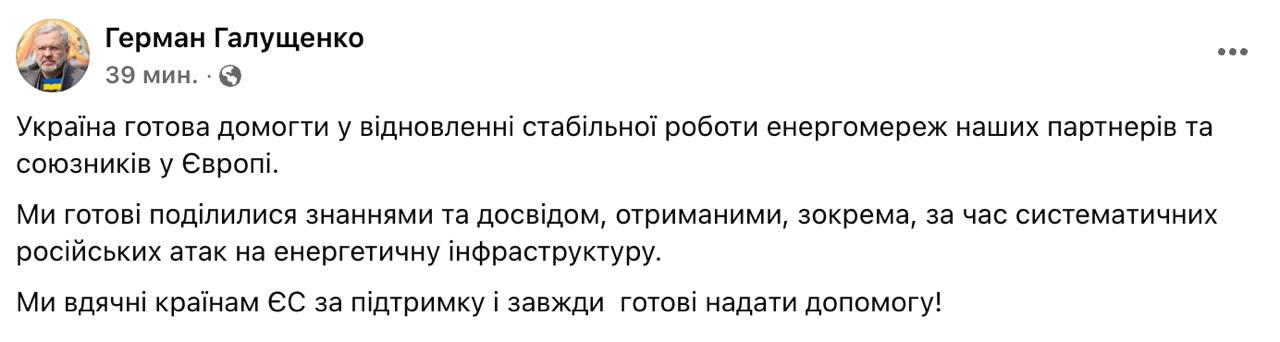 Между тем Украина предлагает свою помощь пострадавшим от масштабного блэкаута странам Пиренейского полуострова. Об этом написал в Фейсбуке министр энергетики Герман Галущенко.
