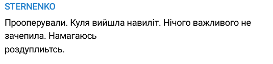 Позже Стерненко рассказал, что пуля, выпущенная в него, прошла навылет и "ничего важного не задела".