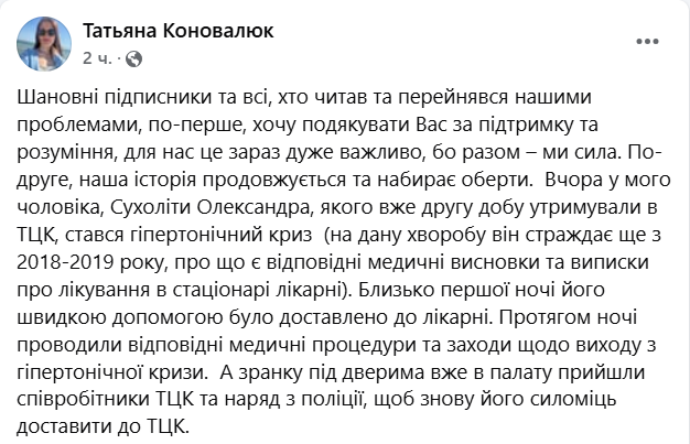 "Около часа ночи скорая помощь доставила его ​​в больницу. В течение ночи проводились соответствующие медицинские процедуры и мероприятия по выходу из гипертонического криза. А утром под дверь в палату уже пришли сотрудники ТЦК и наряд из полиции, чтобы снова его насильно доставить в ТЦК", - пишет она.