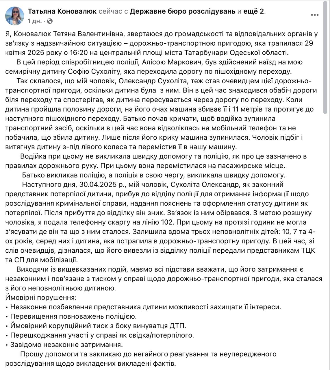 "Узнала, что его вывезли из отделения полиции передали представителям ТЦК и СП для мобилизации", - пишет мама девочки.