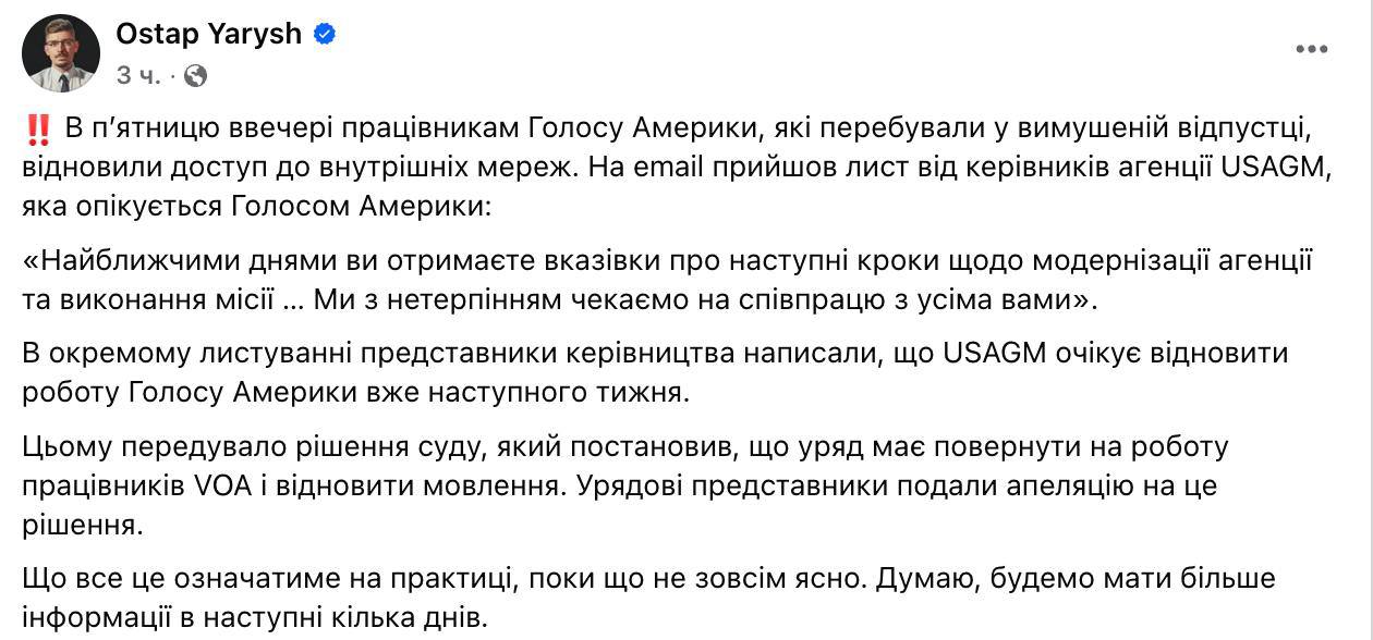 Напомним, возглавляемый Илоном Маском Департамент правительственной эффективности США уволил журналиста украинской службы "Голоса Америки" Остапа Ярыша. Он подтвердил прекращение сотрудничества с изданием в своем Фейсбуке.