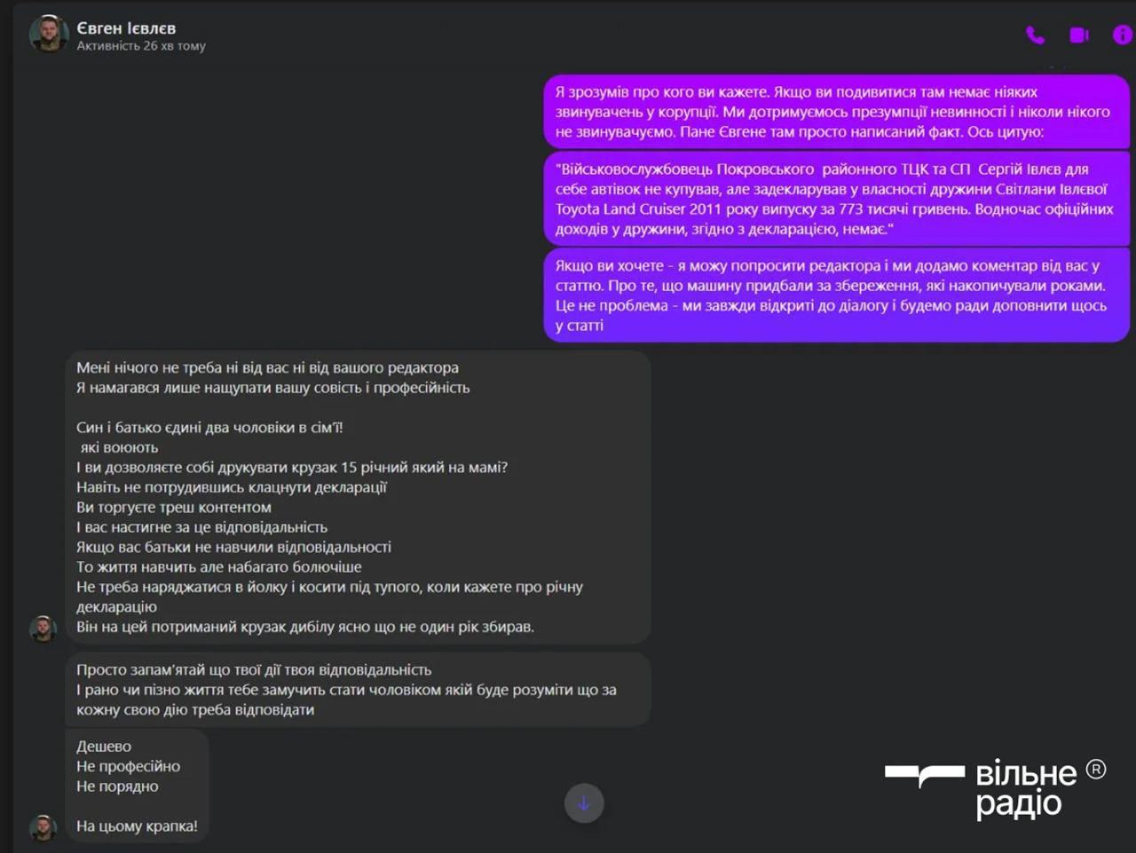 А позже журналист Евгений Вакуленко опубликовал переписку с сыном фигуранта материала, спикером Киевской городской военной администрации Евгением Иевлевым. Тот обвиняет журналиста в непрофессионализме, говорит, что он не изучил в полной мере декларацию, а напоследок угрожает насилием.