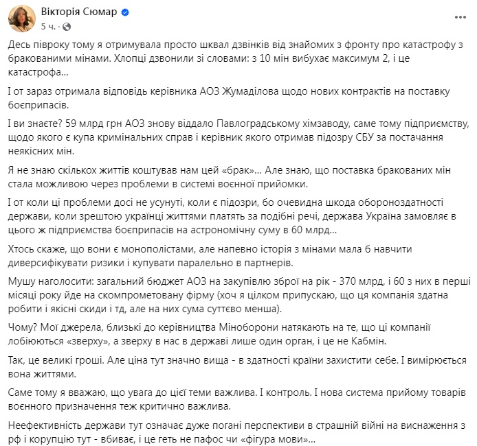 "И вы знаете? 59 миллиардов гривен АОЗ снова отдало Павлоградскому химзаводу - именно тому предприятию, в отношении которого есть куча уголовных дел и руководитель которого получил подозрение СБУ за поставку некачественных мин", - написала Сюмар.