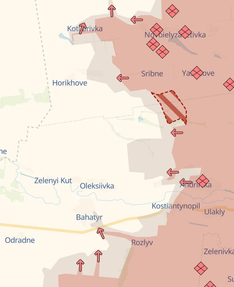 Накануне украинские военные и телеграм-каналы сообщали, что ВСУ теряют контроль над селом Богатырь на трассе Донецк - Запорожье. По данным карты Deep State, за сутки было зафиксировано продвижение россиян к Богатырю со стороны Разлива и расширение серой зоны в самой деревне. Также российские паблики писали, что армия РФ штурмует и Алексеевку севернее Богатыря.