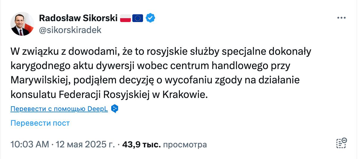 "В связи с доказательствами того, что российские спецслужбы совершили позорный акт диверсии против торгового центра на улице Маривильской, я принял решение об отзыве согласия на деятельность консульства Российской Федерации в Кракове", - написал сегодня в соцсети Сикорский.
