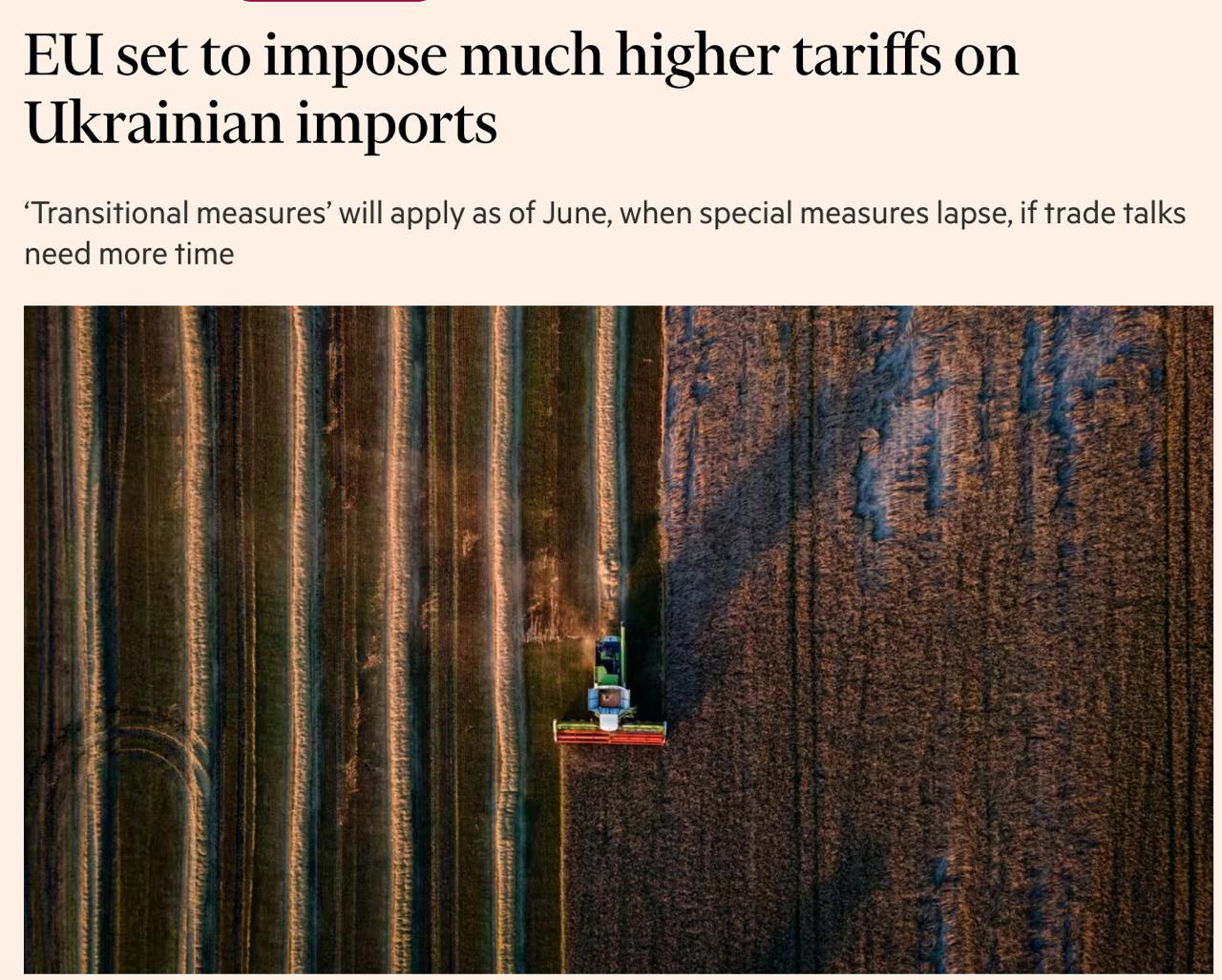"Решение о резком прекращении специальных торговых соглашений, которые позволяли большинству украинских товаров беспошлинно ввозиться в ЕС, было принято после того, как Польша возглавила усилия по защите фермеров блока", - говорится в статье.