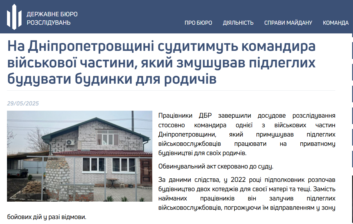 В Днепропетровской области командир воинской части заставлял подчиненных военнослужащих во время войны строить дома для своих родственников.