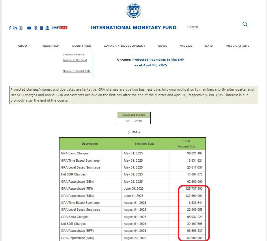 В то же время из данных Международного валютного фонда видно, что в мае 2025 года Украина уже заплатила по ранее предоставленным кредитам МВФ около 211,9 миллиона СПЗ или 294,5 миллиона долларов. В июне Украине предстоит выплата еще 435,5 миллиона долларов (313,3 миллиона  СПЗ), а в августе — 431,7 миллиона долларов (310,5 миллиона СПЗ), что в совокупности значительно больше заявленных 500 миллионов.