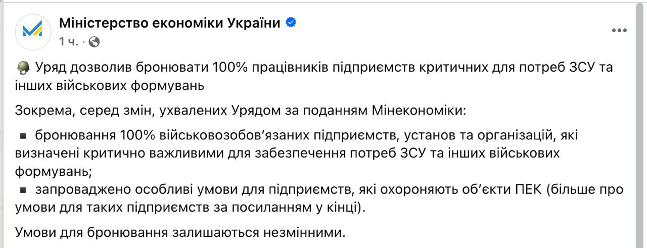 15:45 Предприятия, критические для работы ВСУ, теперь смогут бронировать до 100% работников, уточняет Минэкономики решение Кабмина.