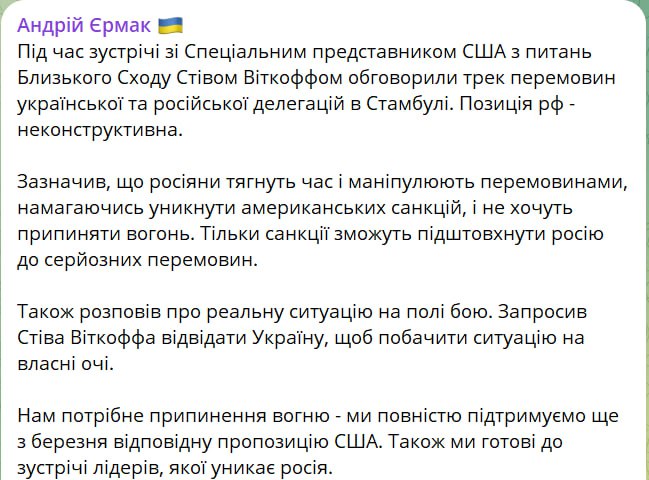 Глава ОП на встрече заявил, что "россияне тянут время и манипулируют переговорами, пытаясь избежать американских санкций, и не хотят прекращать огонь".