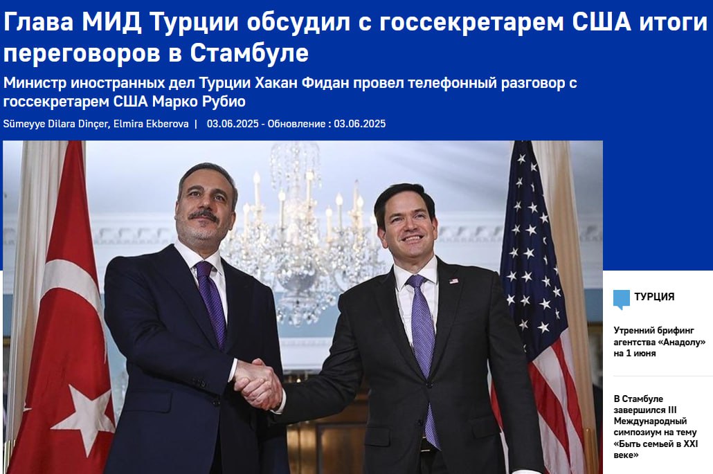 Заявляется, что в телефонном разговоре Фидан и Рубио обсуждали шаги, предпринятые для прекращения войны между Россией и Украиной. Они также обсудили результаты переговоров, состоявшихся накануне в Стамбуле.