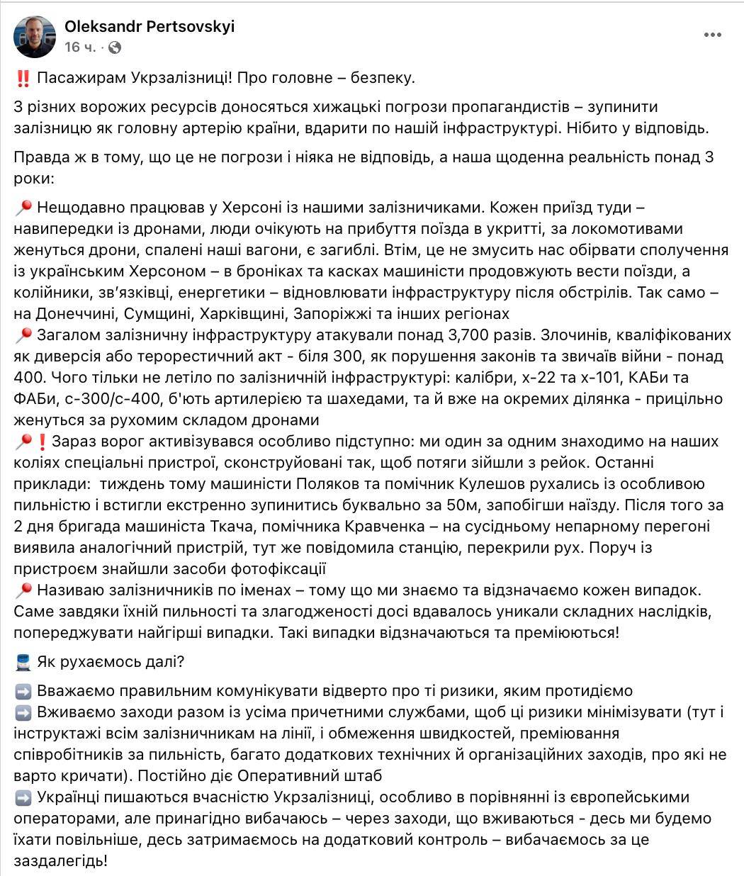 "Из разных вражеских ресурсов доносятся хищнические угрозы пропагандистов - остановить железную дорогу как главную артерию страны, ударить по нашей инфраструктуре. Вроде бы в ответ. Правда же в том, что это не угрозы и никакой не ответ, а наша ежедневная реальность более 3 лет", - говорится в сообщении.