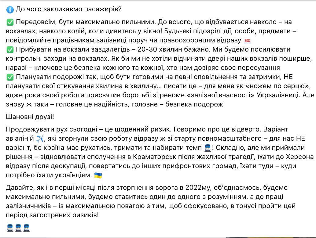 "Мы будем ужесточать контрольные мероприятия на вокзалах. Планируется путешествия так, чтобы быть готовыми на определенные замедления и задержки, не планируйте свои стыковки минута в минуту", - написал Петровский.