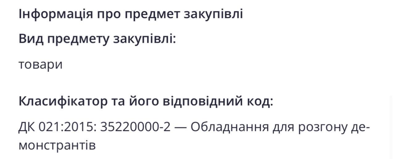 В разделе классификации закупаемого товара указано: "Оборудование для разгона демонстрантов".