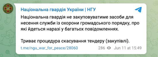 "Национальная гвардия не будет закупать средства для несения службы по охране общественного порядка. Тендер на соответствующую закупку отменен", - сказано в сообщении.