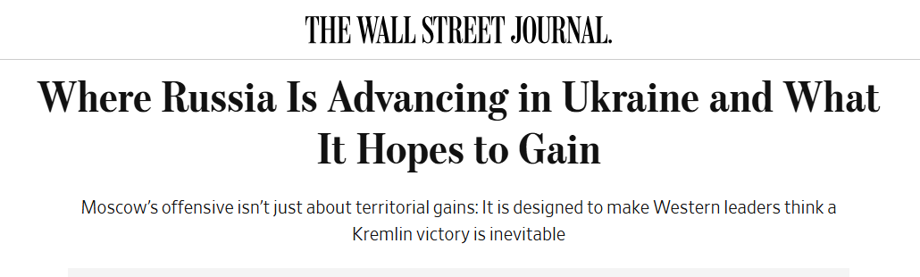 "России удалось ускорить темпы своего продвижения в последние месяцы, как это было прошлой осенью, прежде чем влажные, холодные условия замедлили продвижение Москвы. Мирные переговоры зашли в тупик, вернув внимание к тому, где в конечном итоге решится исход войны: к полю боя. Россия стремится к серьёзным успехам на передовой, чтобы заставить Киев согласиться с ее требованиями, которые, по сути, равносильны капитуляции. Украина хочет сдержать Россию и нанести ей ущерб достаточный для того, чтобы убедить Кремль в том, что стоимость не заключения сделки о прекращении огня слишком высока", - пишет издание.