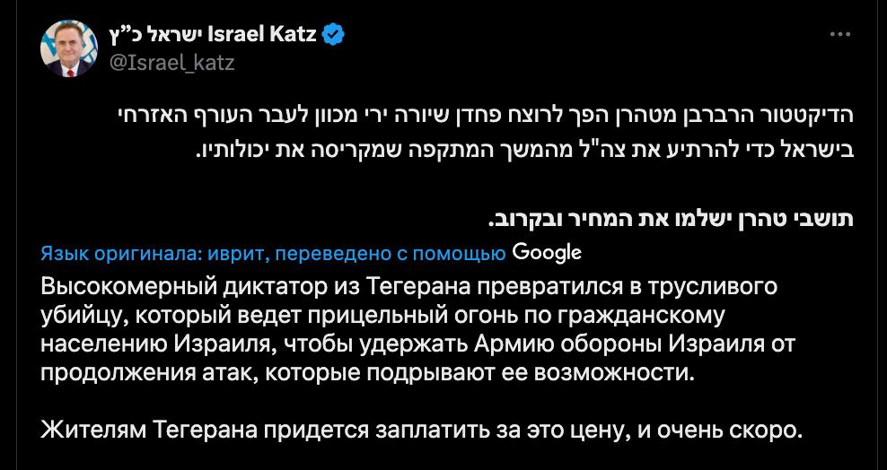 "Жителям Тегерана придется заплатить за это цену, и очень скоро", - заявил Исраэль Кац.