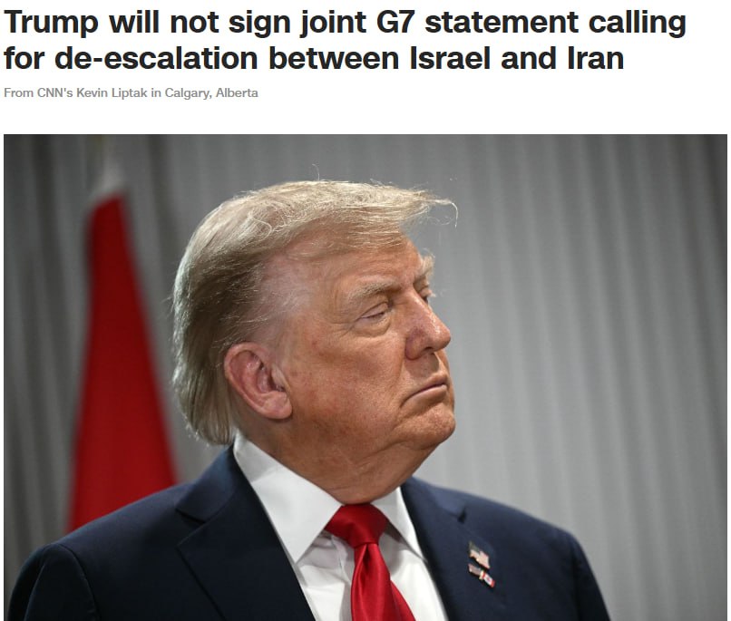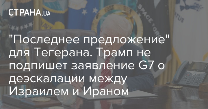 Президент США Дональд Трамп не подпишет совместное заявление стран G7 ("Большая семерка"), призывающее к деэскалации отношений между Израилем и Ираном.