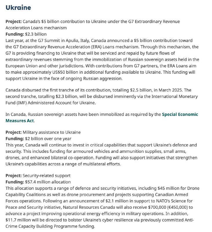В своей речи Карни отметил, что поддержка Украины была согласована устно, и анонсировал выделение Канадой Киеву 5 миллиардов долларов через механизм чрезвычайного кредитования G7.