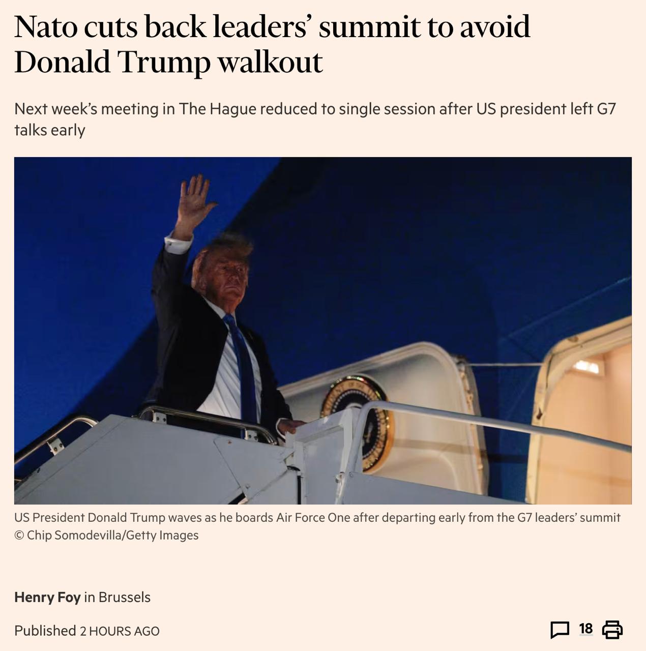 Из-за Трампа саммит НАТО на следующей неделе сократили до одной рабочей сессии длительностью два с половиной часа, чтобы президент США снова не уехал досрочно. Мировые лидеры встретятся в Гааге в рамках саммита Альянса в среду, а Зеленский примет участие в ужине во вторник вечером.