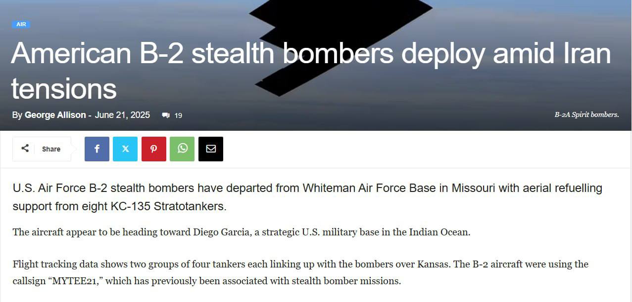 Американские бомбардировщики B-2 вылетели в направлении военной базы в Индийском океане на фоне конфликта Израиля и Ирана.